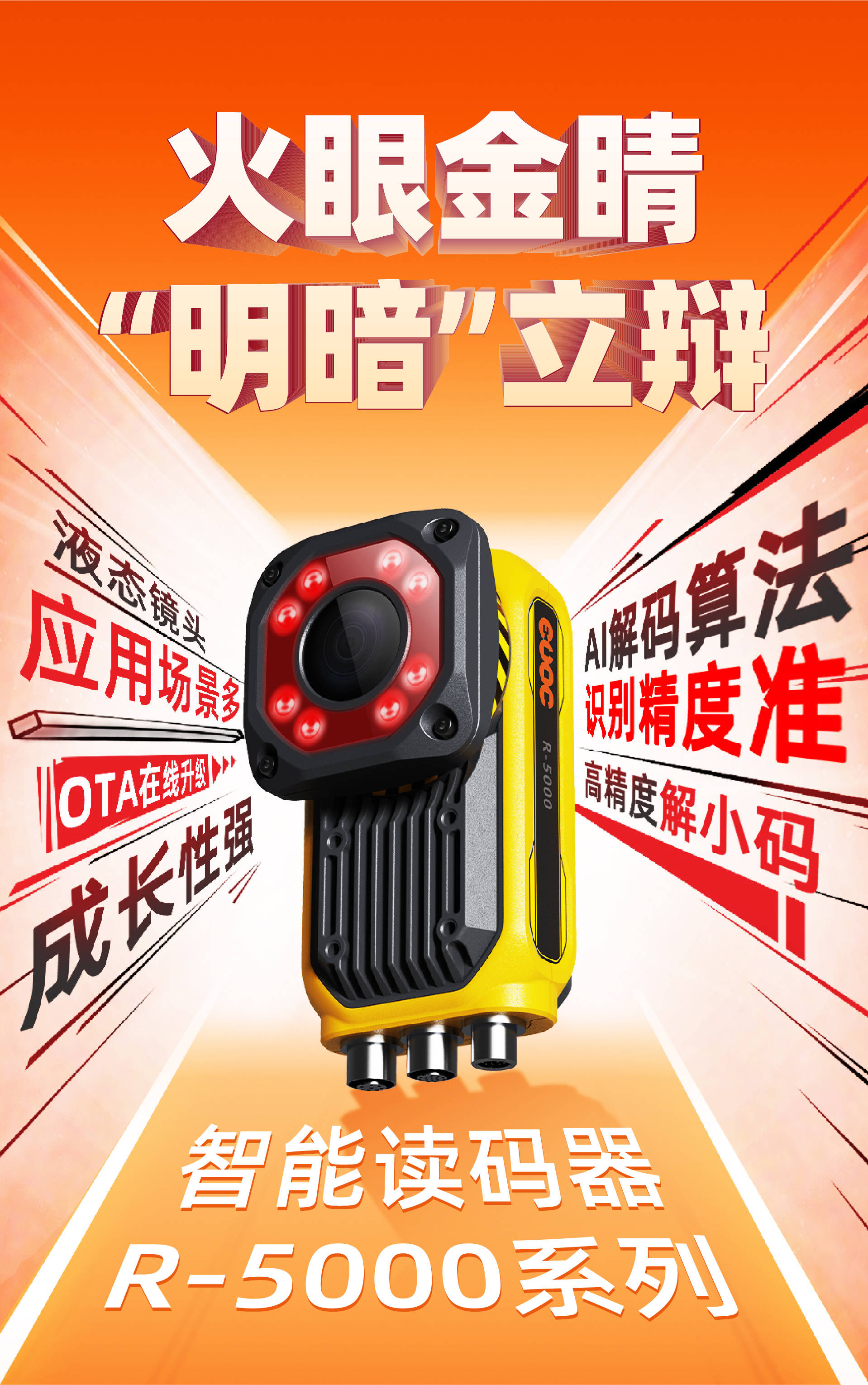 在搬运和出货环节,配置了业内全新液态镜头的R-5000负责在搬运工序中进行分类、读取纸箱上各种条码,不管是脏污、变形、反光、褶皱、还是打印质量差,R-5000通通“一眼看穿”。